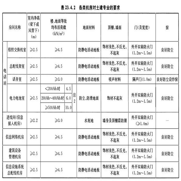 1各類機(jī)房的室內(nèi)凈高、荷載及地面、門窗等要求,應(yīng)符合表23.4.2的規(guī)定